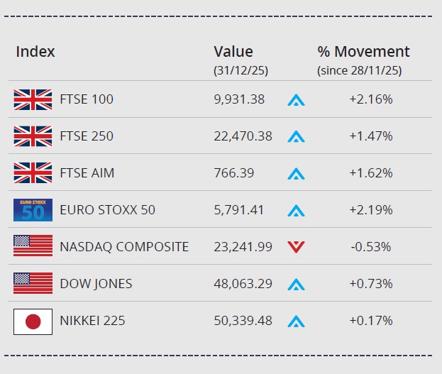 Although major global indices closed 2025 higher year-on-year, trading at month end was mixed, with many markets closing lower on the last day of the year.