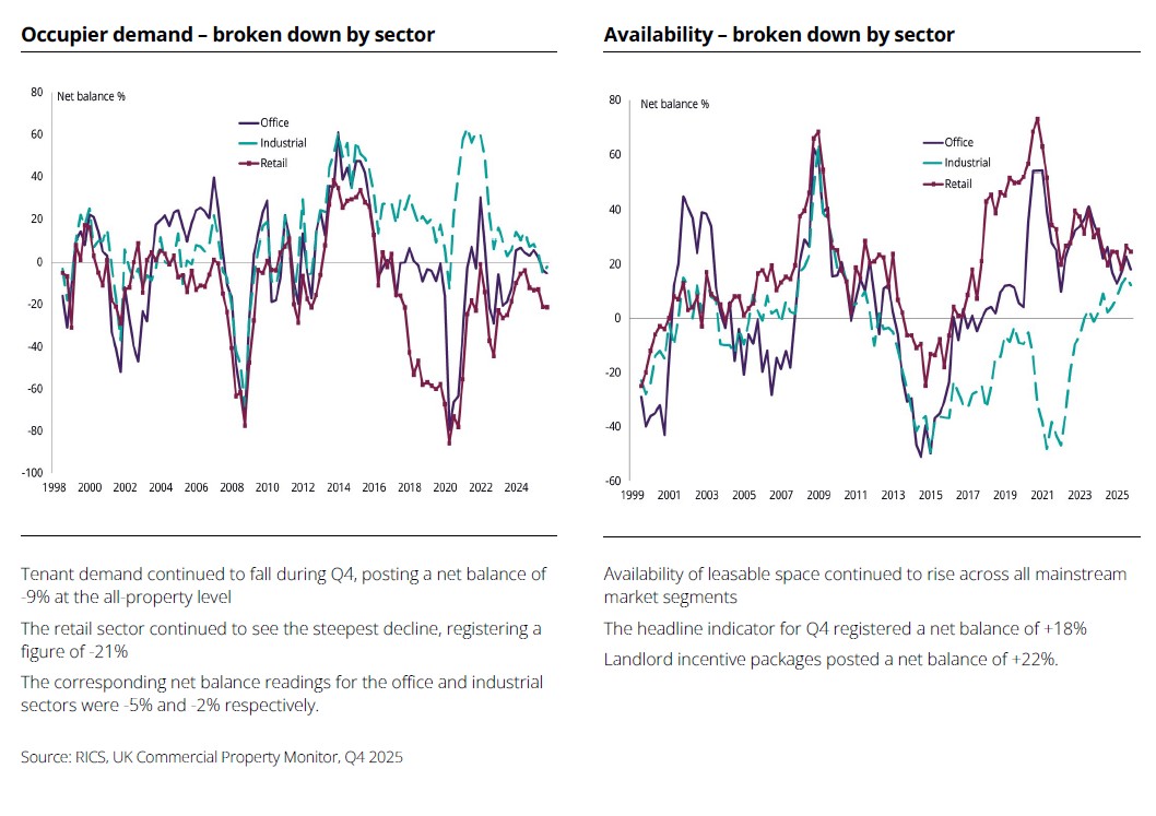 In Q4 2025, a net balance of 12% of respondents reported an increase in occupier demand for Scottish commercial property. Performance varied across subsectors; a net balance of 39% reported a rise in demand for the industrial sector, while -12% noted a drop in demand for retail space.