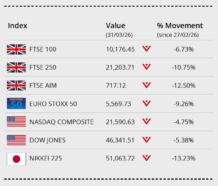 In the UK, the FTSE 100 closed the month over 6% lower on 10,176.45 and the mid-cap focused FTSE 250 ended March over 10% down on 21,203.71. The FTSE AIM recorded a loss of over 12% in March to close the month on 717.12. The Euro Stoxx 50 closed the month over 9% lower on 5,569.73. In Japan, the Nikkei 225 closed March on 51,063.72, falling over 13% in the month. In the US, the Dow Jones closed the month down over 5% on 46,341.51. The NASDAQ registered a monthly loss of 4.75% to close on 21,590.63.